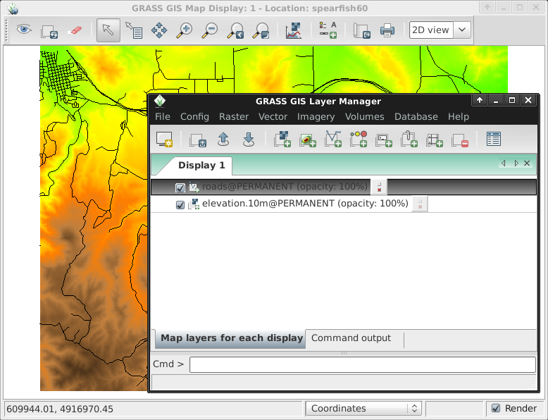 Once inside add a raster map layer such as “elevation” from the PERMANENT mapset. To do this go into the GIS Layer Manager window and click on the checkerboard toolbar button with a “+” on it. Then select the map name you want from the “map to be displayed” pull-down list, and click [Ok].