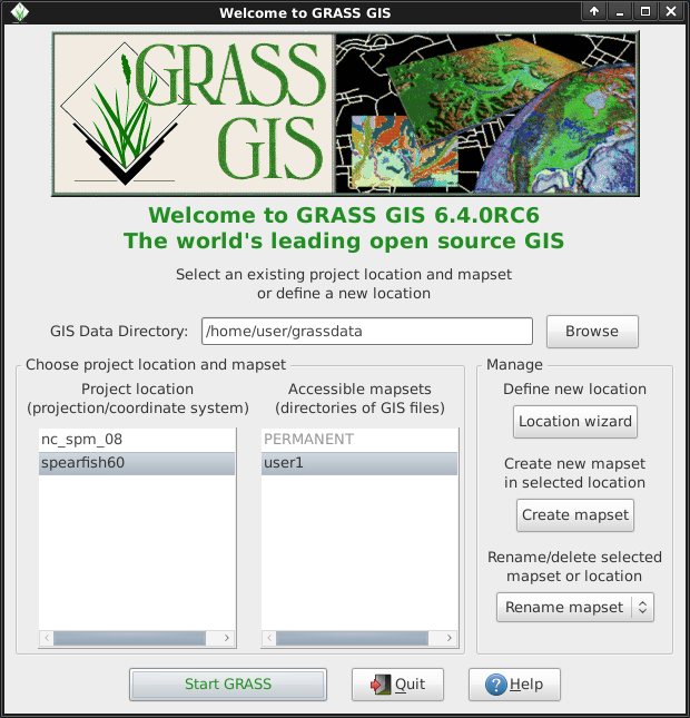 To run GRASS on the Live DVD, click on the GRASS link on the desktop. From the “Welcome to GRASS” window select either the Spearfish or North Carolina (nc_spm_08) dataset for the location, and “user1” for the mapset, then click on [Start Grass].